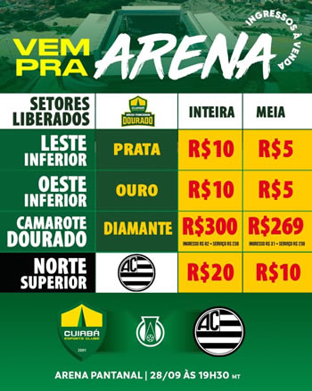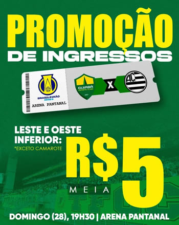 O Cuiabá anunciou ingressos promocionais para a próxima partida na Arena Pantanal, válida contra o Athletic, no domingo (28). As entradas terão preços a partir de R$5, medida adotada após o presidente do clube questionar, na zona mista após a vitória sobre a Chapecoense, o que ainda impedia os torcedores de irem ao estádio. “Será que o cuiabano não gosta de futebol?”, chegou a indagar o dirigente.